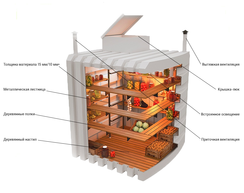 Наши погреба уже в базовой комплектации оборудуются лестницей, освещением, полками и вентиляцией!